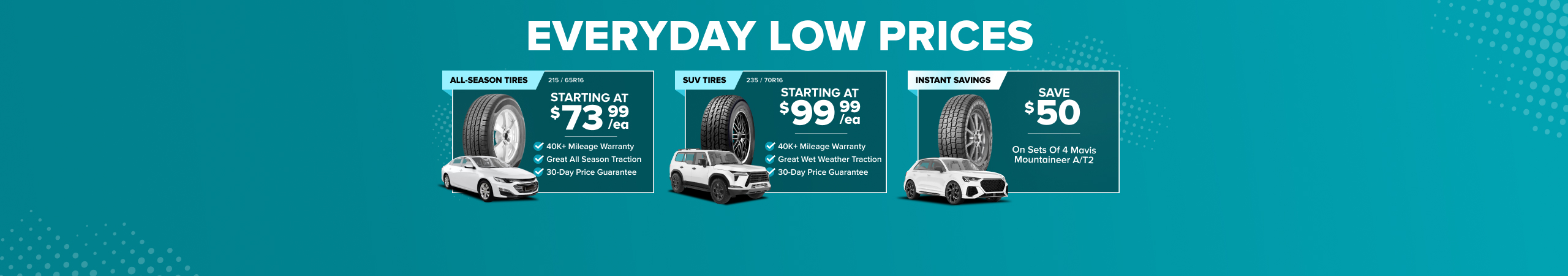 Mavis buys tires at national scale, which allows us to secure better pricing from manufacturers and pass those savings directly to customers. We constantly move tires across our national network, so you get same-day or next-day installation at most locations. Our goal is transparent, everyday low prices on high-quality tires and services.